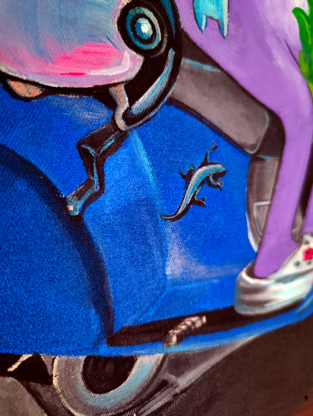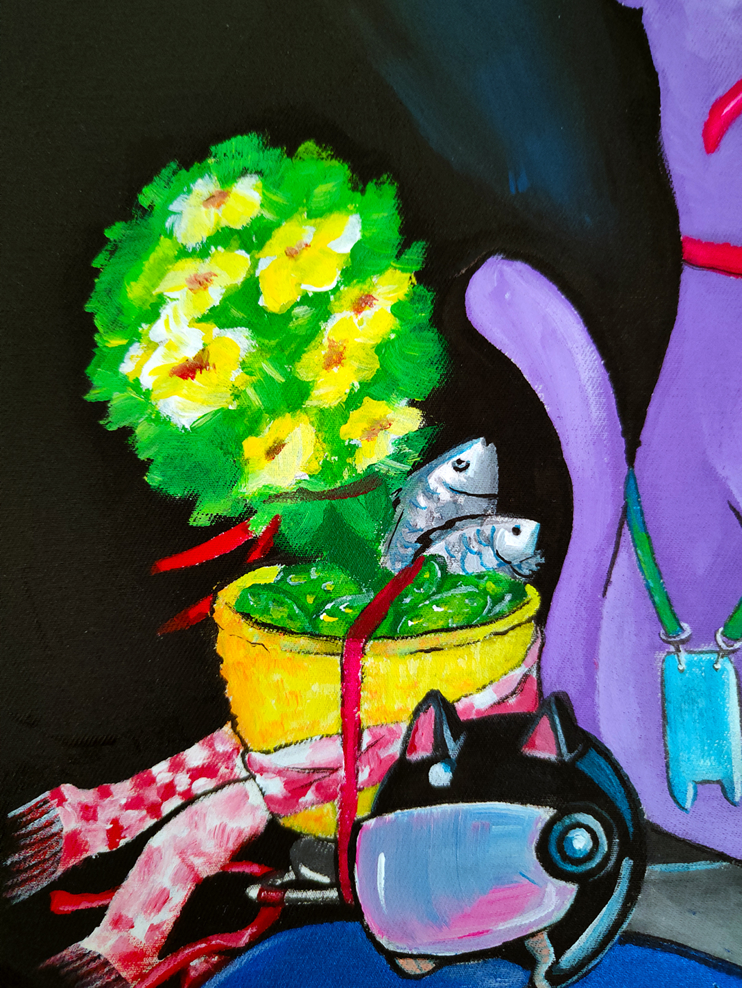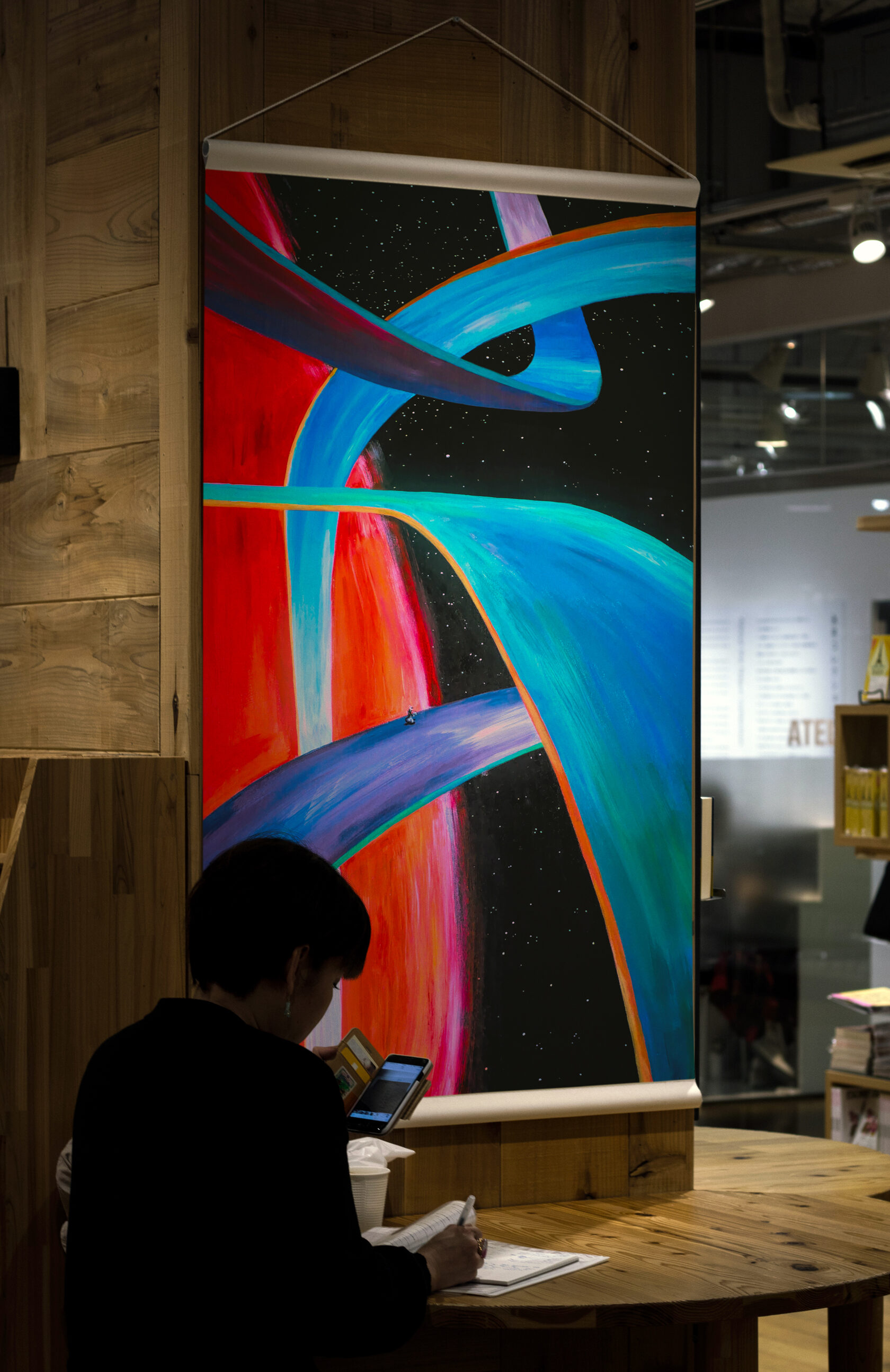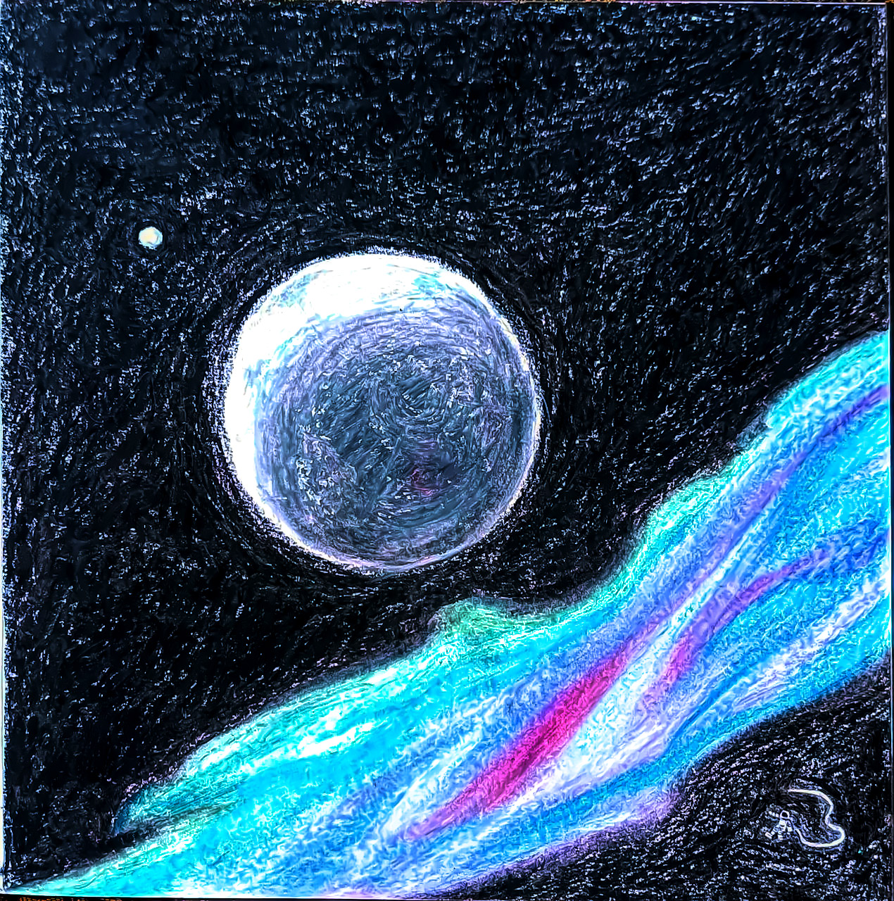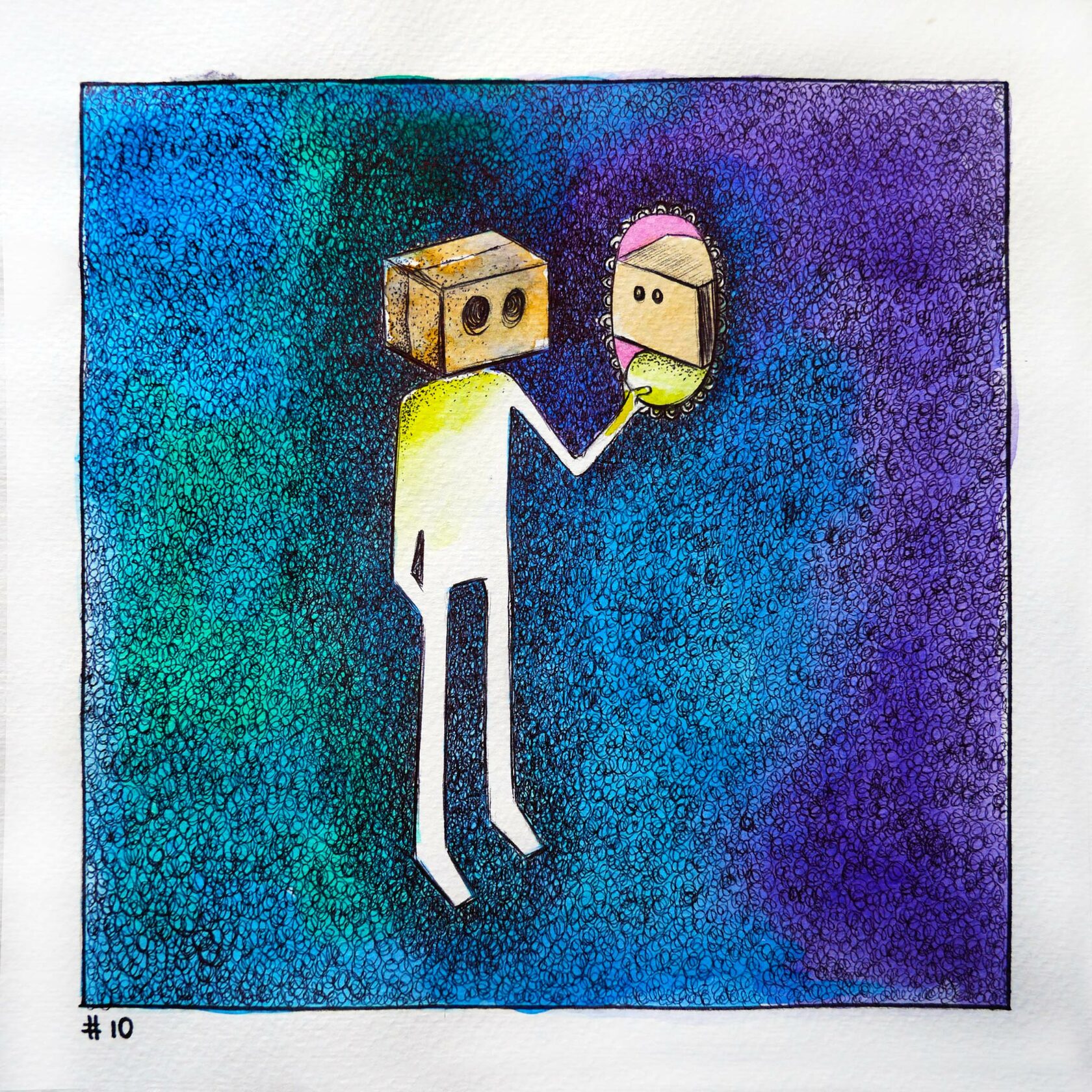 My work combines various natural colours, with the setting painted exclusively with strokes in different directions. I usually complete my work with only one tool.